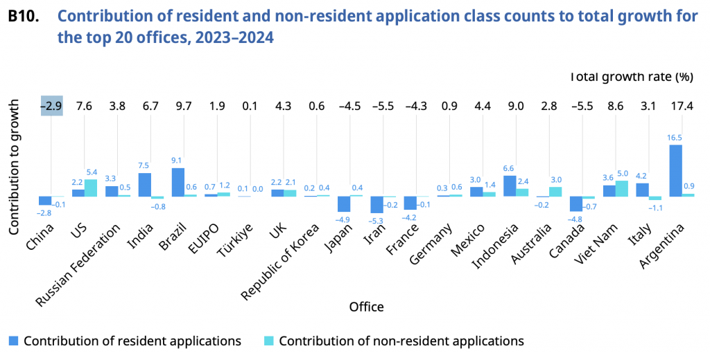 Kantor KI Indonesia—bersama dengan Tiongkok, India, dan Vietnam—melaporkan porsi terendah untuk permohonan yang terkait kelas jasa (berkisar antara 28% hingga 32%), yang menunjukkan fokus yang lebih besar pada barang. Secara spesifik, porsi kelas jasa di Indonesia adalah 28,3%.