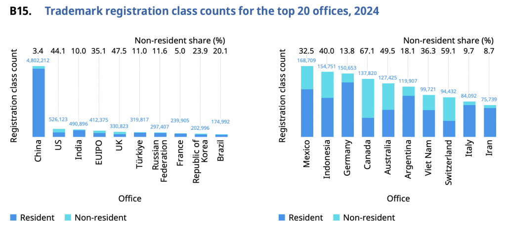 Indonesia menempati peringkat ke-15 di antara 20 kantor teratas untuk jumlah kelas Permohonan Merek pada tahun 2024, dengan total 166.118 kelas yang diajukan. - Pendorong Pertumbuhan: